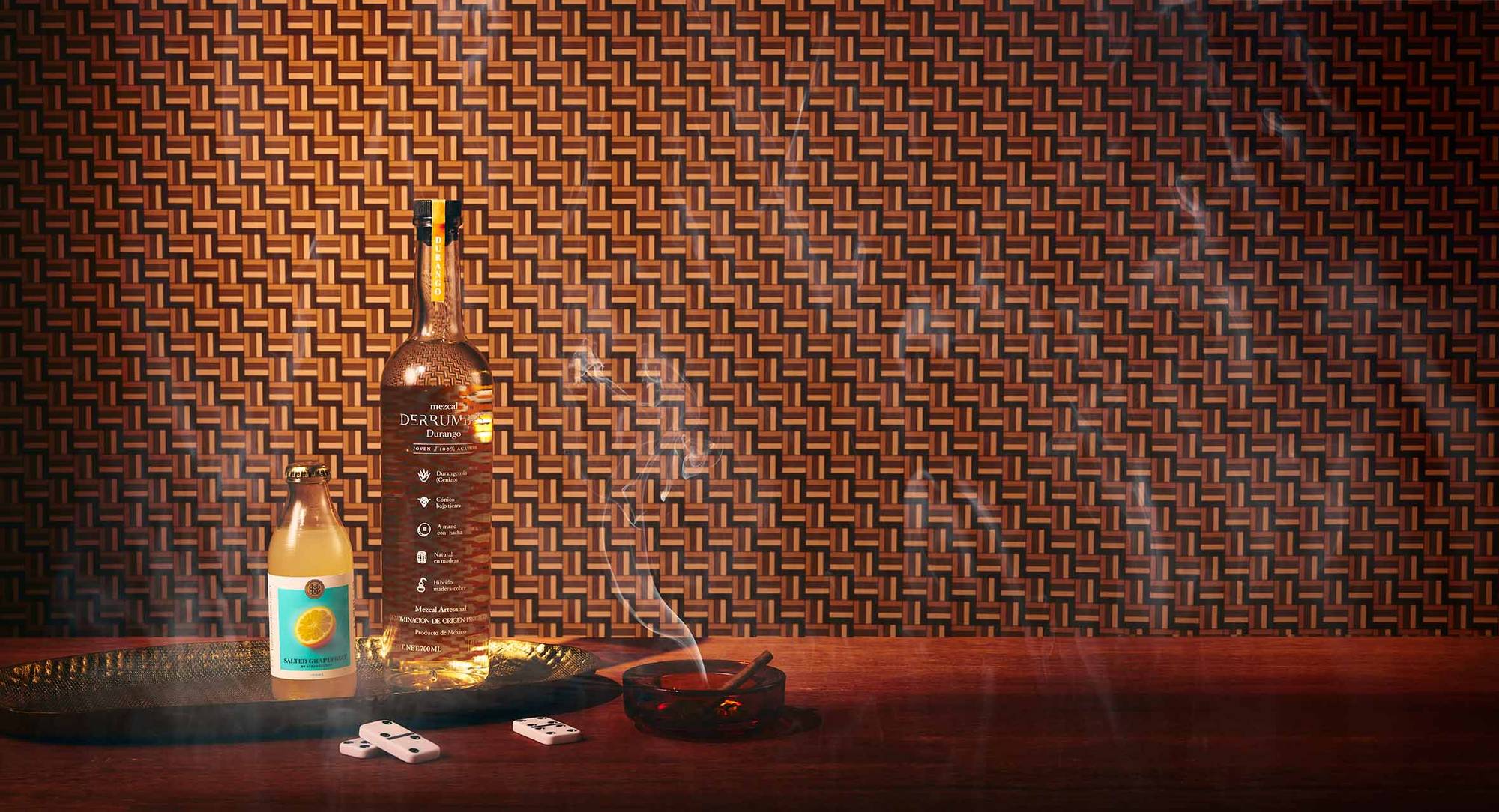 Build chilled ingredients one by one into a tall glass, mezcal, agave syrup, and salted grapefruit mixer.